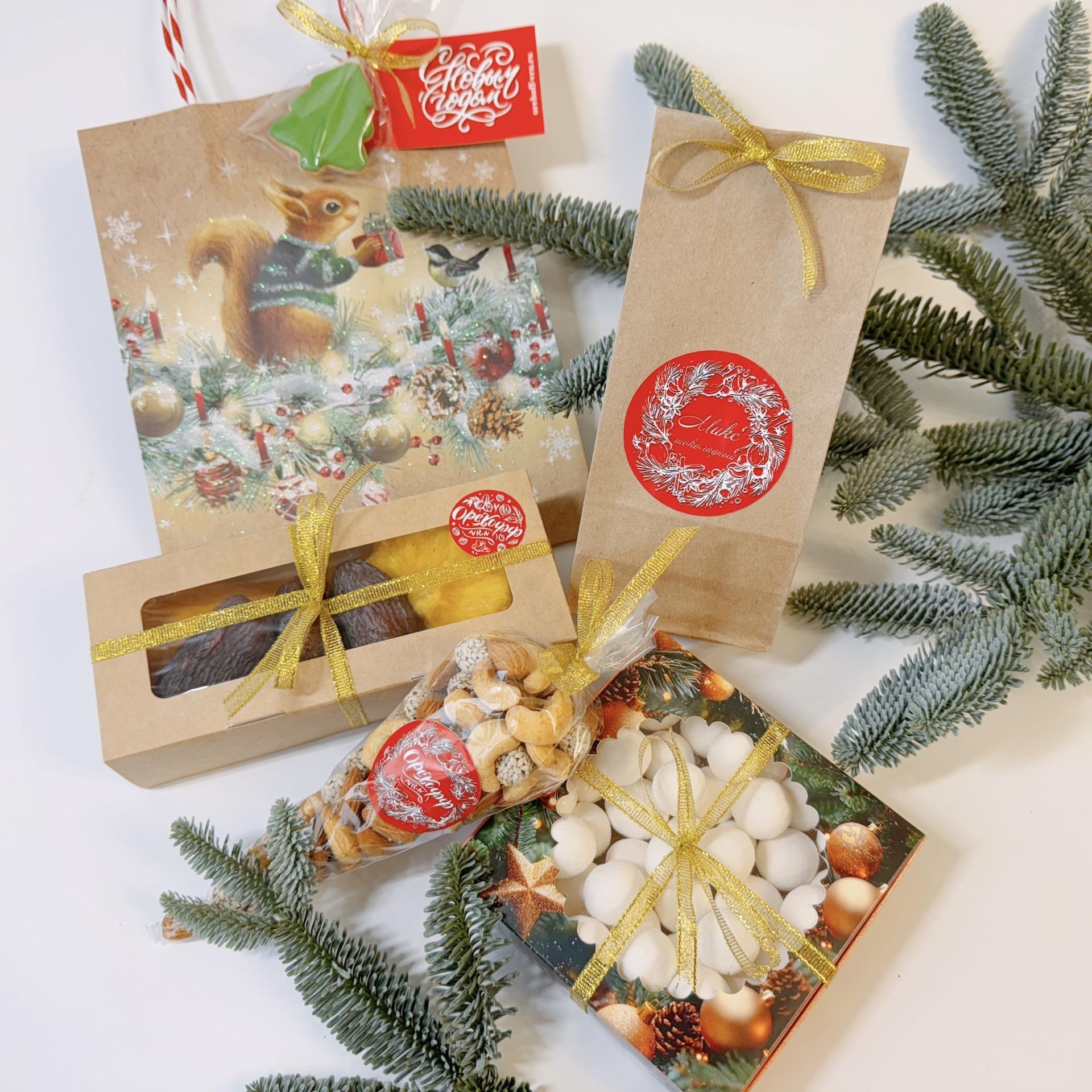 Коробочка клюквы в сахаре, микс обжаренных орешков (кешью, миндаль, арахис в кунжуте), коробочка премиальных сухофруктов (манго, ананас, королевские финики), микс орехов в шоколаде (кешью, фундук, арахис, миндаль) и ароматный имбирный пряник в виде елочки.