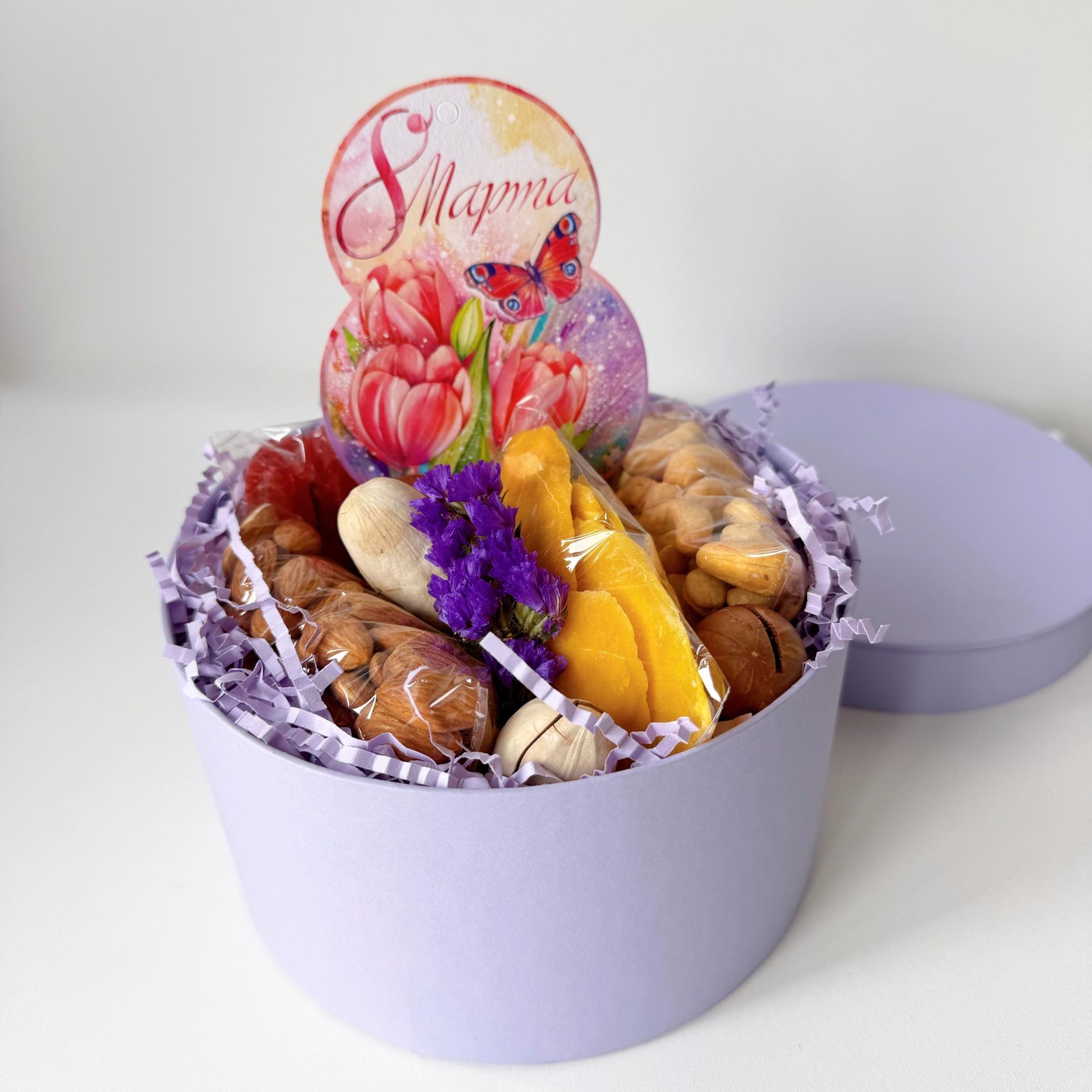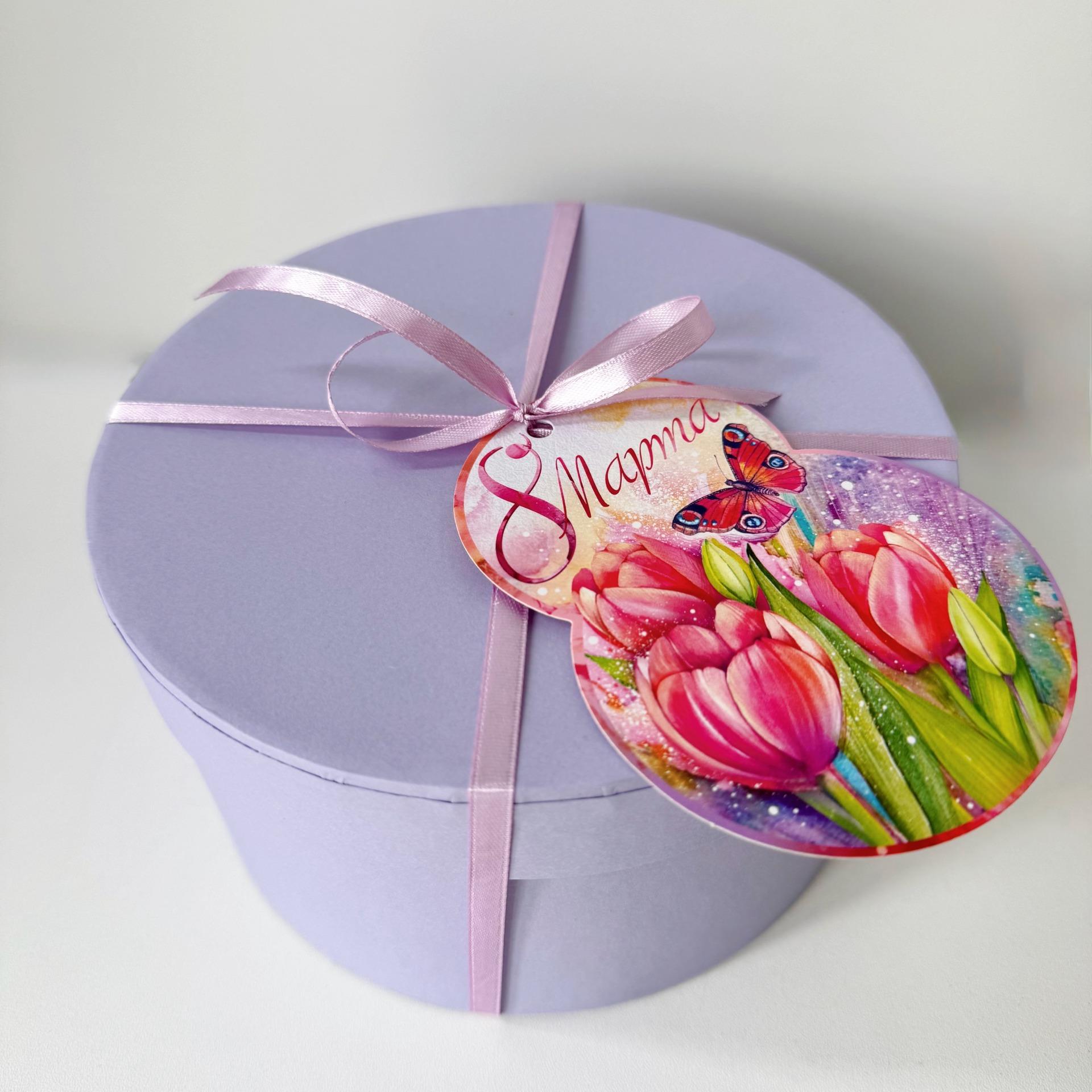 Бокс "С 8 марта" сиреневый круглый (800гр)