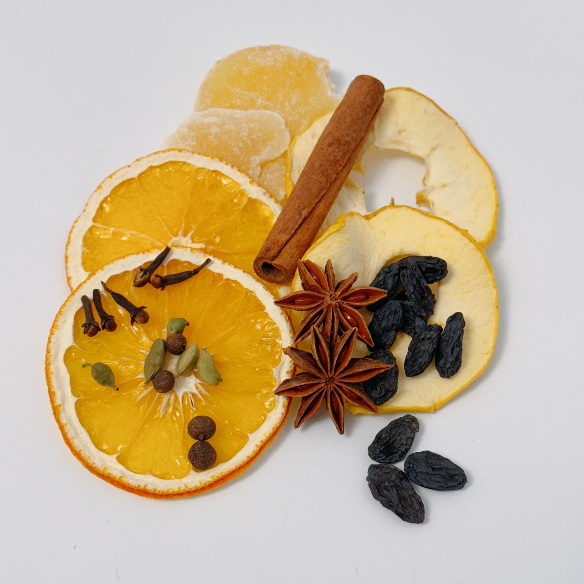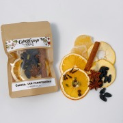 Смесь пряностей "Для глинтвейна", состав: апельсин сушеный, яблоко сушеное, имбирь в сахаре, изюм, гвоздика, кардамон, корица палочки, бадьян, перец душистый.